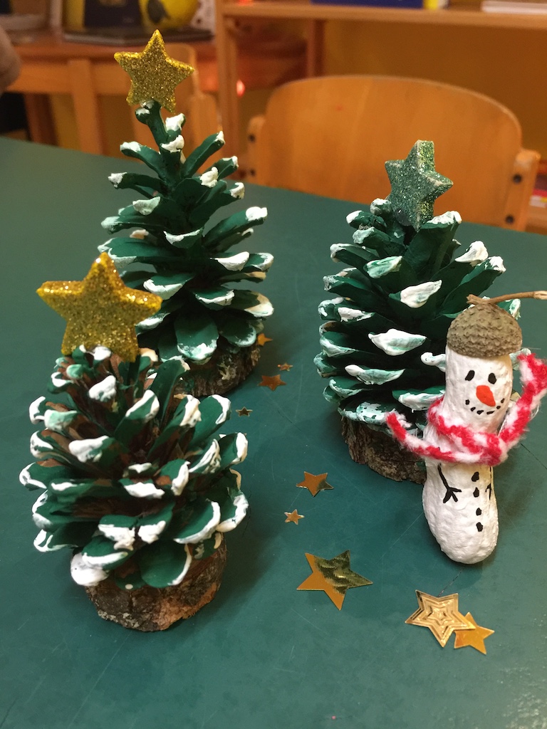 Außerdem kann ein kleines Adventsgesteck aus Naturmaterialien oder Weihnachtsbaumschmuck gestaltet werden.