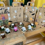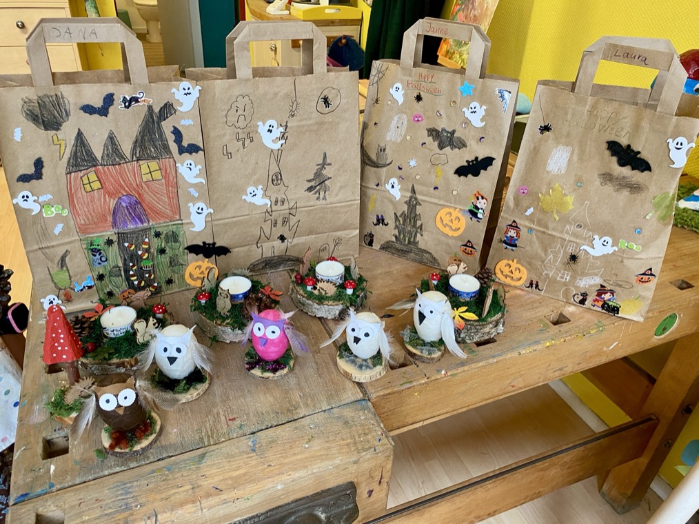 Es werden Gespenster , Fledermäuse und Kürbisse aus verschiedenen Materialien wie Gips, Holzscheiben, Stoff und Papier gebastelt.